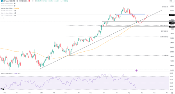对于纳指来说,本周焦点在于能否守住年初开始的上升趋势。在出现反弹迹象之前,指数恐将继续承压,关注在14300-14500区域的潜在支撑。上行方向的关键目标为15200一线。
