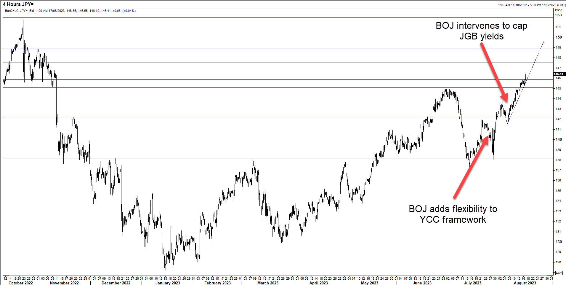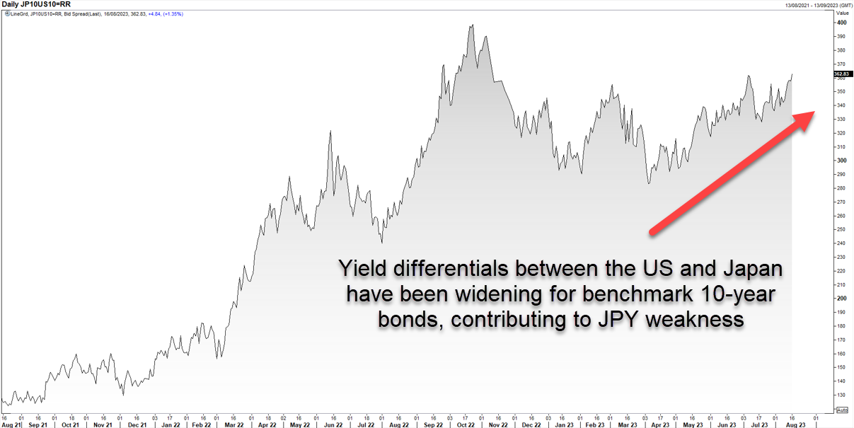 美国和日本的国债收益率差距的主要扩大原因是日本央行正通过收益率曲线控制(YCC)策略限定日本国债(JGB)的收益率,以平衡市场对美国和其他主权债务收益率的上涨压力。虽然日本央行上月为其债券购买计划设定了一个更为灵活的范围,即将0%的基准收益率偏离目标的容忍度从0.5%增至1%,但它仍然频繁干预,确保收益率不超过0.66%。
